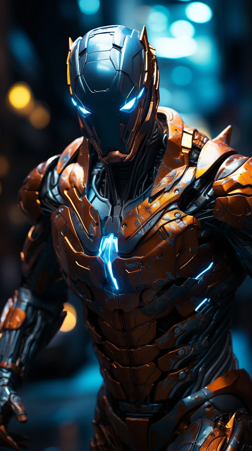 a man dressed in iron man armor standing in the dark, in the style of orange and azure, 8k 3d, dark silver and brown, lightningwave, eye-catching detail, knightcore, ue5 --ar 71:128