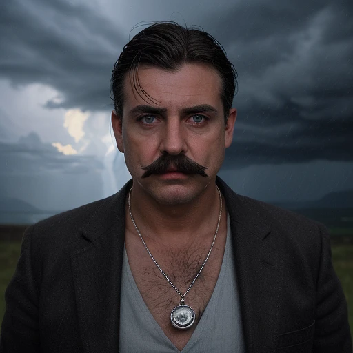 MALE, Middle Age, with a silver necklace that has a small orb held in a claw, Side-parted slick back Dark brown Hair, blue eye color, wide face scarred from war, travelers clothes, large build, thick mustache, square jaw, full body portrait, cinematic film, dreamy landscape, dramatic lighting, rainstorm,