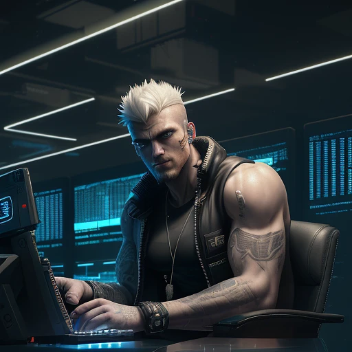 The Trading room is digital art dim, with only the white light from the screens illuminating the room. The alpha dog Trader is sitting in front of a wall of large trading screens, typing code on a keyboard. He wears cyberpunk crypto coin implants and drinks extra large coffee. He loves coffee. The programmer is surrounded by chaos, hyper realism, high detail, octane render, celestial arena,  fire storm,  ice storm,  body crackling with lightning,  lightning halo,  tilted halo,  crackling lightning,  lightning charged atmosphere,  beautifully detailed fur,  brilliant detailed eyes,  beautifully detailed face, but he doesn't seem to notice or care. Digital Art. 3D Render 8k