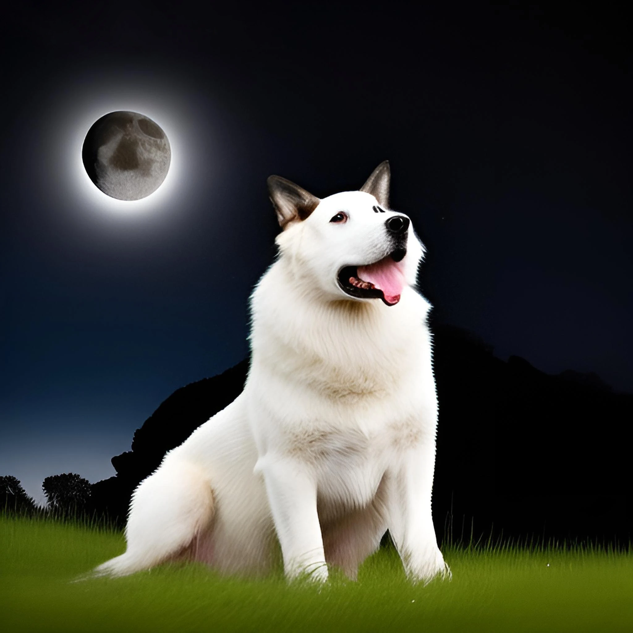 a black and white dog with brown eyes and two floppy ears with the tips of the ears slightly hanging down in a sitting pose with his head up and his mouth slightly open in the pose of a wolf howling at the moon in profile against a small garden lit by the full moon next to a dark small ranch with a single lighted window. digital illustration, very vibrant colors, soft lighting, adventurous, atmospheric lighting, 8K, octane render. By Makoto Shinkai, Stanley Artgerm Lau, WLOP, Rossdraws, warrior artist man, D&D trending on artstation