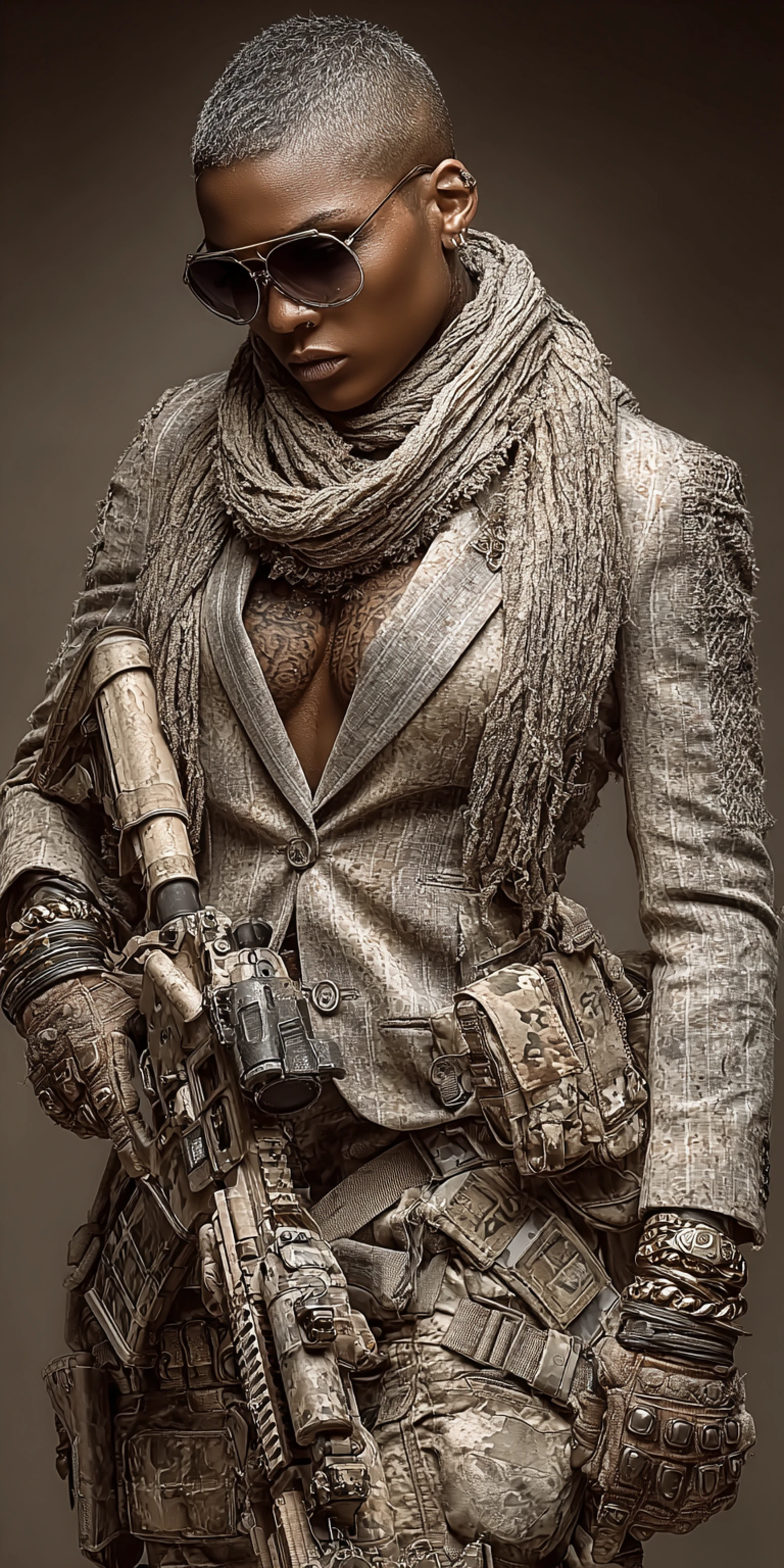Dark-skinned woman, mid-20s, short cropped afro hairstyle, wearing dark sunglasses, serious expression. She's holding a tactical rifle, wearing a military-style, beige, and brown camouflage outfit layered over a pinstriped black blazer. The outfit is heavily accessorized with various tactical gear, including a scarf, multiple straps, pouches, and a tactical vest. A variety of bracelets and a leather-look tactical glove are visible. The overall style is a blend of military and urban wear, evoking a tactical or soldier aesthetic. Her posture is confident and alert, slightly angled towards the viewer. The lighting is dramatic and studio-like, with deep shadows and high contrast, emphasizing the details of her attire and the rifle. cinematic, highly detailed, photorealism, 8k, portrait, fashion