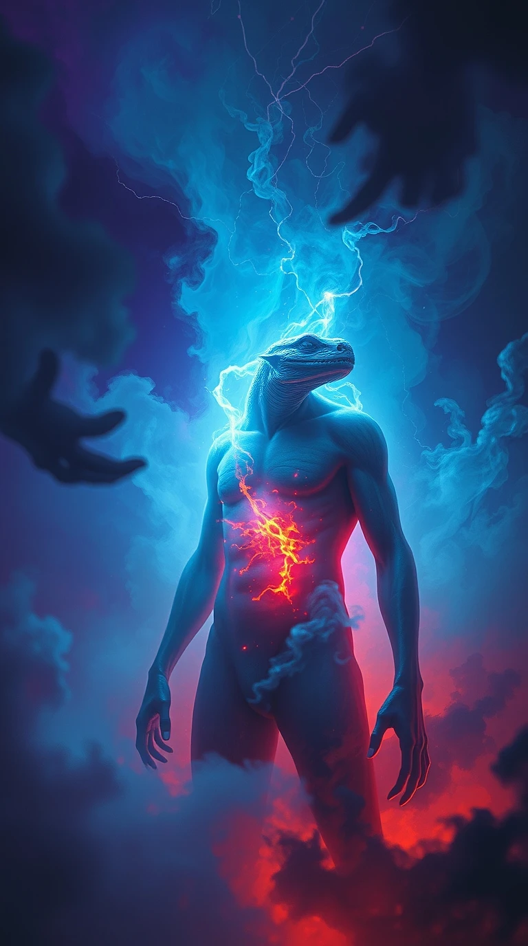A digital painting of a spiritual possession scene: a reptilian entity entering a human body, surrounded by ethereal light and smoke in electric vivid colors, thick fog, low visibility.