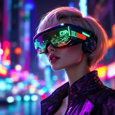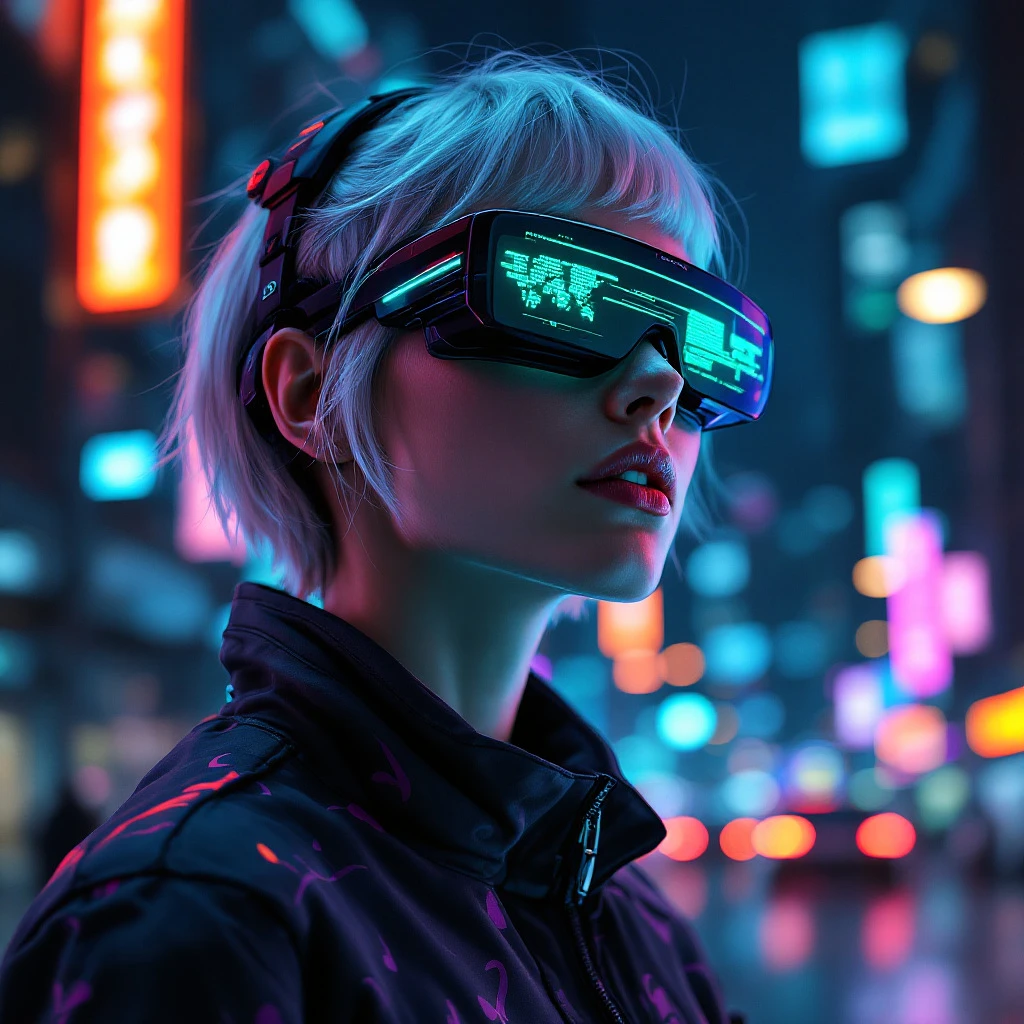 A futuristic digital illustration features a woman wearing augmented reality glasses in a vibrantly neon-lit urban night scene. The woman is looking, not talking, just looking. The composition of the image is centered on the female figure, which occupies the left corner of the screen space. The perspective is frontal, with a slight downward angle. The woman is the main figure, and the background, an urban scene, is blurred, giving emphasis to the protagonist. The background represents a nighttime city, with tall buildings and vibrant lights. There is a sense of movement and speed, suggested by the neon lights and vibrant colors. She sports a futuristic and cybernetic look, with augmented reality glasses that display neon green patterns, which look like moving data. Her short, light hair is well-defined, and her glasses and accessories are highly detailed, with modern visual effects and bright colors. She is wearing a dark jacket, with visible patterns in shades of purple and neon green, and her skin has a texture that makes it look like a metallic and synthetic material. The art style is predominantly digital, with an emphasis on graphics and lighting. The vibrant colors and neon lighting in the background contribute to the futuristic atmosphere. The rendering technique appears to be digital, with a focus on the detailed representation of visual elements, creating an interesting contrast between the character's elements and the background elements. The environment is a modern city at night, with tall buildings and colorful lights that create a dynamic and technological atmosphere. The lighting is highly saturated and contrasted, with a wide range of vibrant colors, mainly greens and blues. The atmosphere is futuristic, vibrant and dynamic, with an undertone of energy and technology. The lighting highlights the female figure, making her the center of attention, while the background colors create a counterpoint that complements the central figure and intensifies the futuristic feeling.