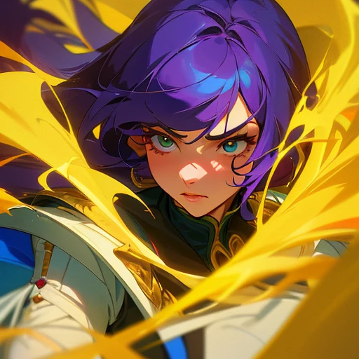 The girl is the centerpiece of the image, and every detail of her is rendered in intricate detail. Her hair is a deep shade of purple, falling in loose waves around her shoulders. Her face is angular, with high cheekbones and full lips. Her eyes are large and expressive, framed by thick lashes that fan outwards. She exudes a sense of strength and confidence, her body language conveying a sense of determination and purpose.