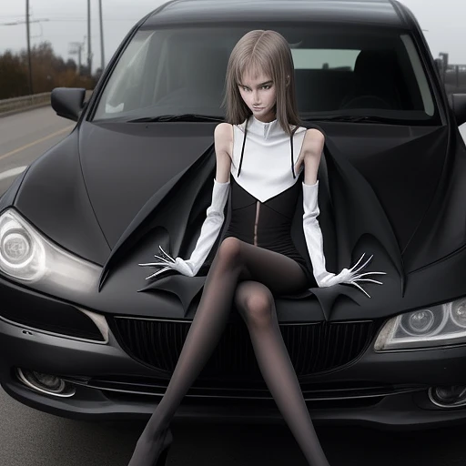 a needle-thin anorexic girl with skinny long legs and long skinny calves in high heels with long hooked claws, in black tights, sitting on car's hood