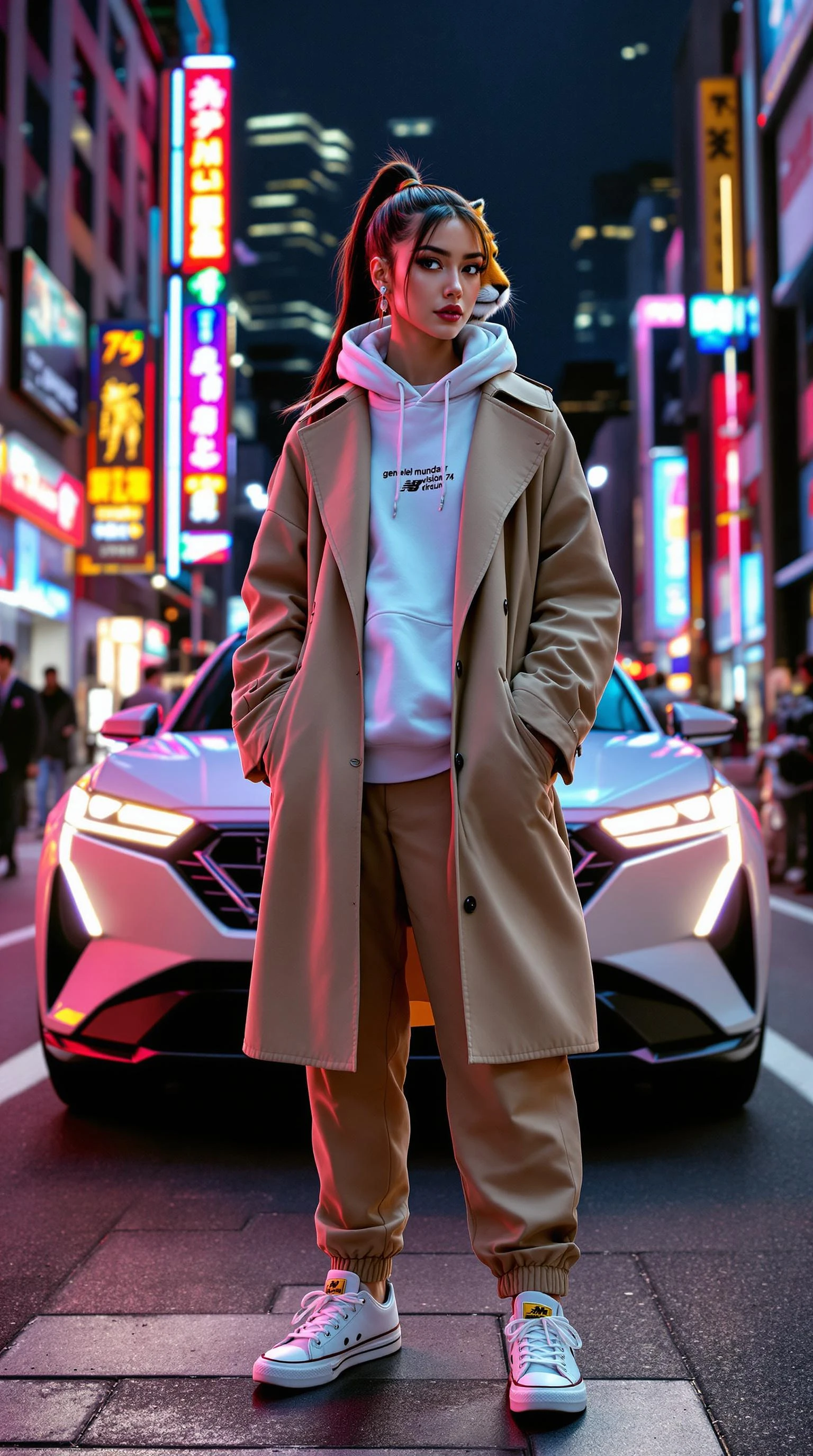 A stylish woman with a sleek ponytail, wearing a Gentle Monster hoodie, oversized trench coat, and New Balance sneakers. She stands in front of a Hyundai N Vision 74 in the neon glow of Seoul's Gangnam district. A man with the head of a tiger wears a Wooyoungmi blazer, cropped trousers, and Converse Chuck Taylors, blending streetwear with sophistication