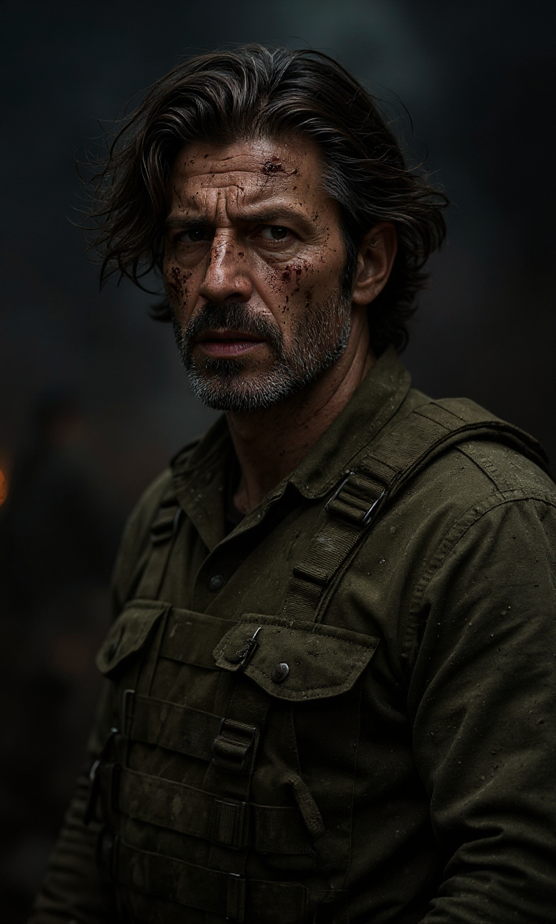 FLUX prompt: The British SIS agent stands after the battle, fea...