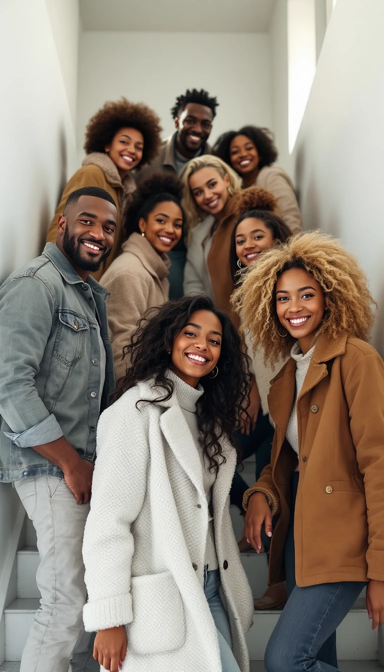 Photo of a 8 ultra realistic mixed race friends, in a tight white modern stairway, men and women, in their 30s and 40s, facing the camera, smiling, fashionable, in the style of hyper-realistic National Geographic photography, expressive, hyperrealism, photorealistic, detailed hair, hyper detail, cinematic lighting --ar 1:2 --stylize 750
