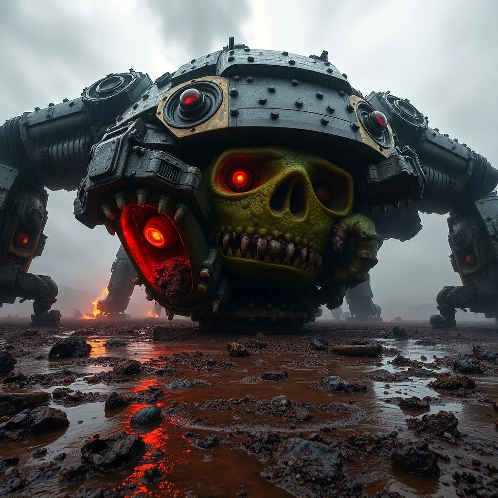 [Dutch Angle Wide-FOV] (Mechanical Leviathan:1.9) Massive amphibious juggernaut looms large on rain-soaked battlefield, repurposed corpses melded with cold steel machinery. Crater-blasted terrain strewn w/ blasted debris amidst muddy slop as bile-belching vents cloud rancid air. Brutal fusion of warty toad flesh and riveted armor adorned in garish fluorescent paint, fleshless metal jaws clamping on twitchin’ critters while bloodshot eyes blaze crimson through murky hellscape. Apocalyptic scene rendered in gruesomely realistic 16:9 format, every slimy texture and pocked rust detail exposed as cinematic light and shadow dance over the depraved machine’s monstrous form, awe-inspiring and terrifying to behold.