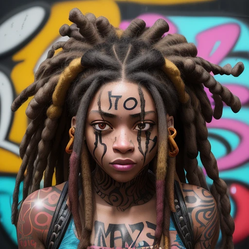 Dreadlocks girl, in the style of dynamic and exaggerated facial expressions, graffiti word art, trending on artstation Panasonic Lumix s pro 50mm f/1. 4, gritty reportage, explosive and chaotic, sony alpha a7 iii, tattoo-inspired, uhd image --ar 69:128 --s 750 --v 5. 2
