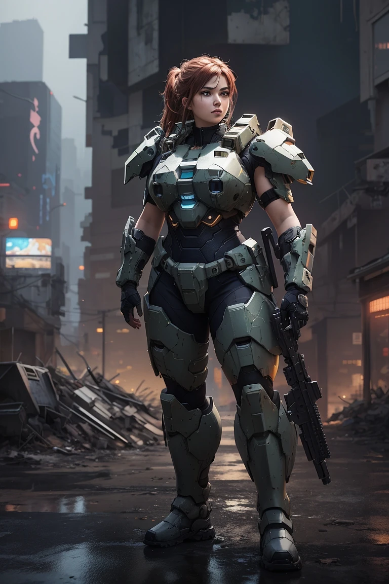 character portrait of a big bulky female warrior in halo spartan armor in a desolate cyberpunk wasteland city, 8 k, realistic shading, concept art, digital painting, illustration, matte painting, moody lighting, sharp focus, minimal artifacts, wet, john singer sargent, william - adolphe bouguereau