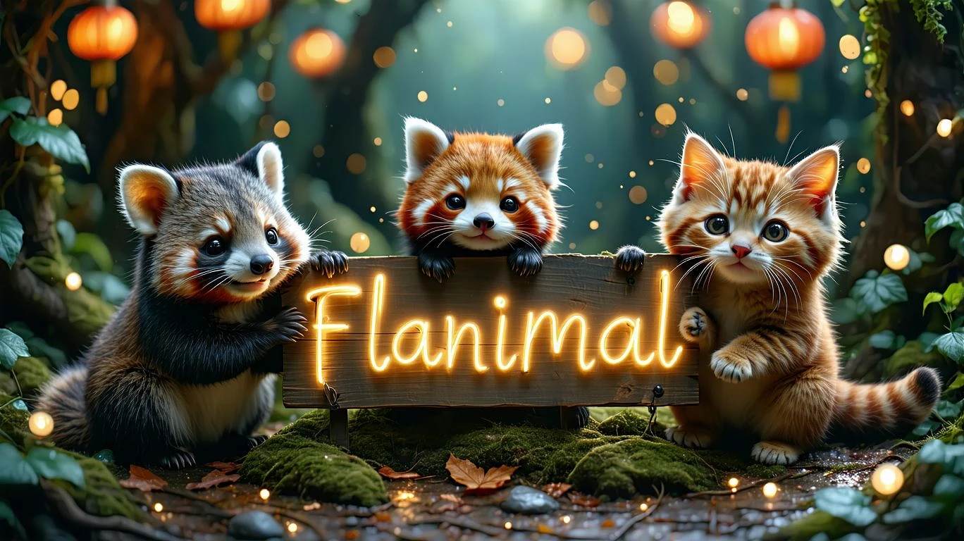 "A stunning 16K UHD hyper-realistic image featuring the four cutest animals in the world— a Quokka, a Red Panda, an Axolotl, and an adorable Cat— all sitting together in a magical, playful setting, holding a beautifully designed glowing sign that says 'Flanimal' in the center with their tiny, soft paws gently gripping it. The text is bright, slightly neon, and has a warm, soft glow, making it stand out while maintaining a cute and elegant feel. Each animal has ultra-realistic textures: the Quokka has its signature happy smile, fluffy fur, and bright, expressive eyes full of joy; the Red Panda has thick, soft fur with an adorable, curious expression, slightly tilting its head; the Axolotl has smooth, soft skin with pink feathery gills glowing slightly, giving an innocent and magical vibe; and the Cat is a fluffy kitten with big, round eyes, adding extra charm and warmth to the scene. The background is a dreamy, fantasy-like setting with soft neon lighting, sparkles, and a warm golden glow, creating a bright, cheerful, and irresistibly cute atmosphere. The lighting is soft yet vibrant, with realistic shadows and highlights enhancing each detail. The composition is perfectly balanced with the animals and the 'Flanimal' sign at the center, and a slight background blur (bokeh) adds depth, making the characters and text stand out beautifully. Hyper-realistic fur, reflections, textures, and vibrant colors give the image a premium and adorable look, making it visually stunning and engaging. "