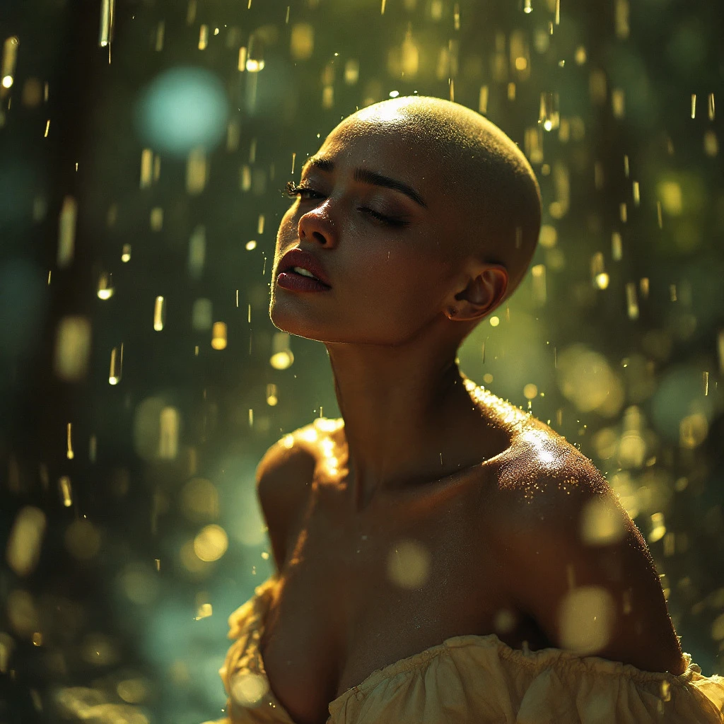 A nostalgic scene of a sad teary eyed bald young woman dancing in the rain, with natural lighting creating a warm glowon