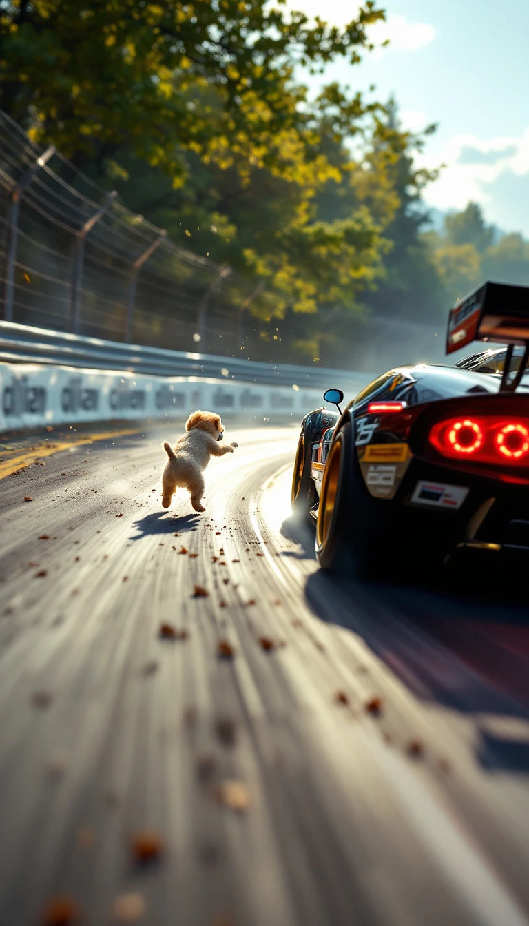 Summer. The first racing car, racing along the race track, makes a sharp turn. A little dirt flies from under the wheels and a car passes next to a small puppy clinging to the road in horror. The camera looks from the side and slightly from above the car. The race track is well lit by the sun. Style - cyberpunk