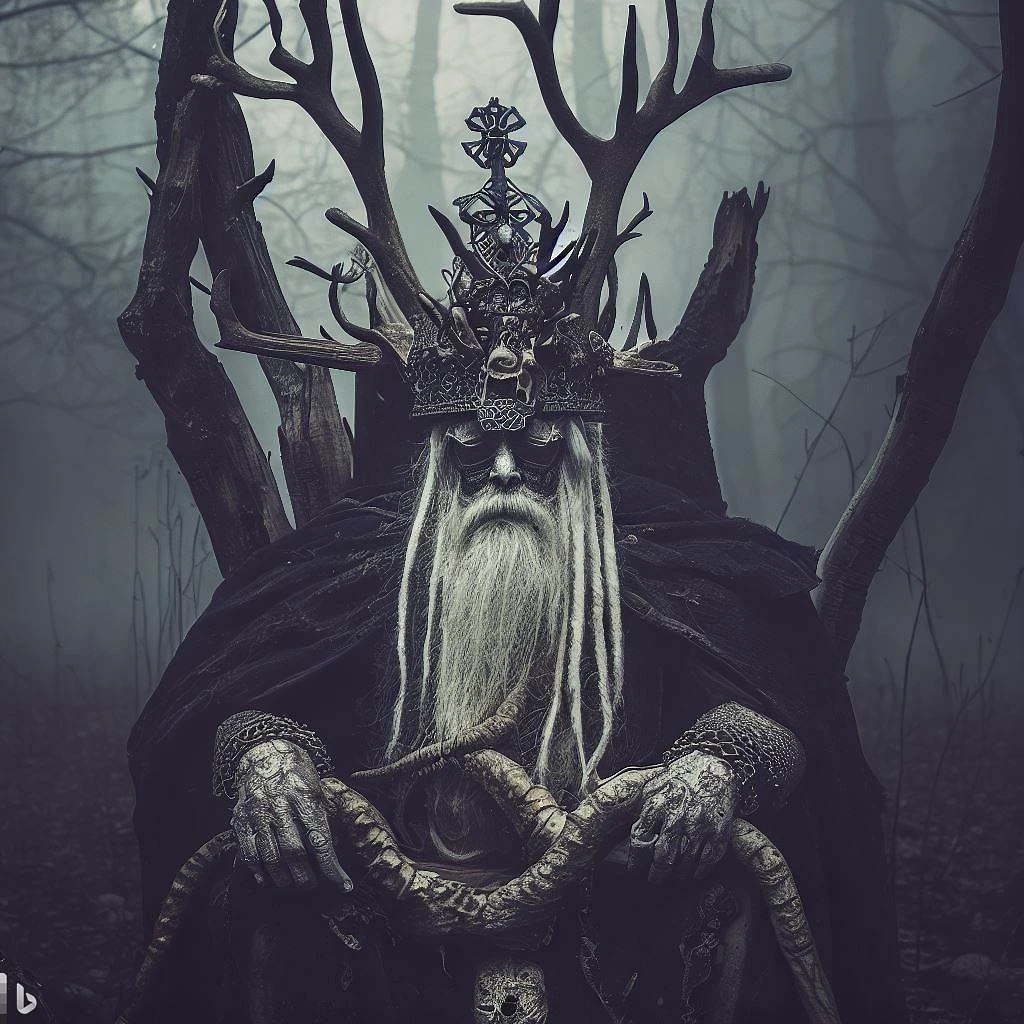 viking north druid lich mermaid king wise old man god of death witch pagan face portrait, covered in runes, crown made of bones, necromancer, creepy, occult, harvest, dark, domiation, zdzisław beksiński, mikhail vrubel, hr giger, gustav klimt, symmetry, mystical occult symbol in real life, high detail, sitting on an old stump like a throne, fog in forest in background, dramatic light