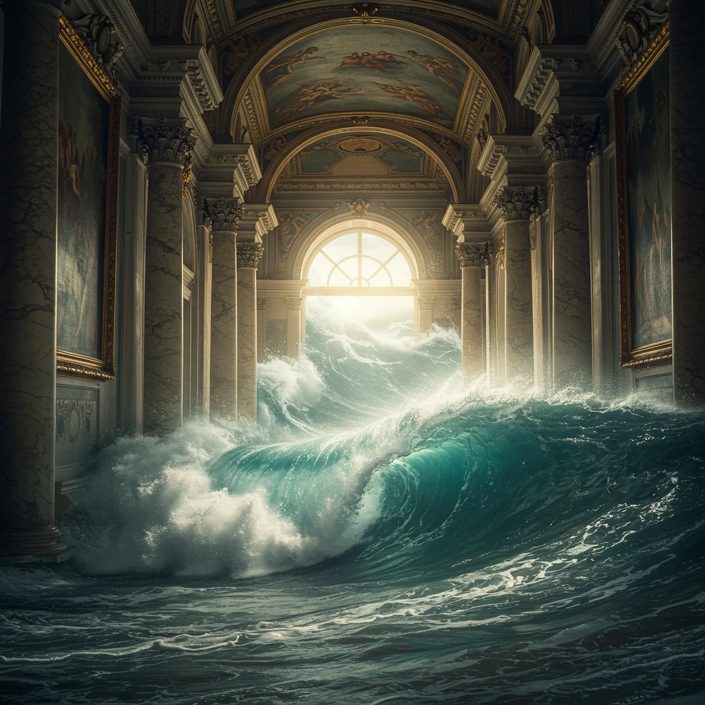 hyper realistic scene of a grand palace hallway with towering columns and gilded paintings, suddenly flooded by colossal ocean waves the waves crash against pillars, their foamy crests glowing in sunlight from a distant arched window a surreal clash of opulent architecture and wild sea power, evoking awe misty sea spray diffusing the light