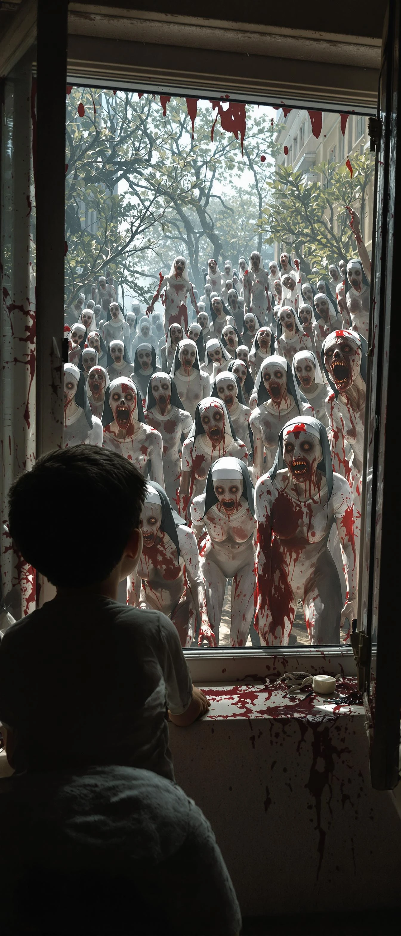 A boy looking from a window at daylight and sees many walking womem zombies . Their body are exposed and covered with blood . Many nuns zombies . Hyperrealistic. Hyper details . Hyper face and body details . 8k . High quality .