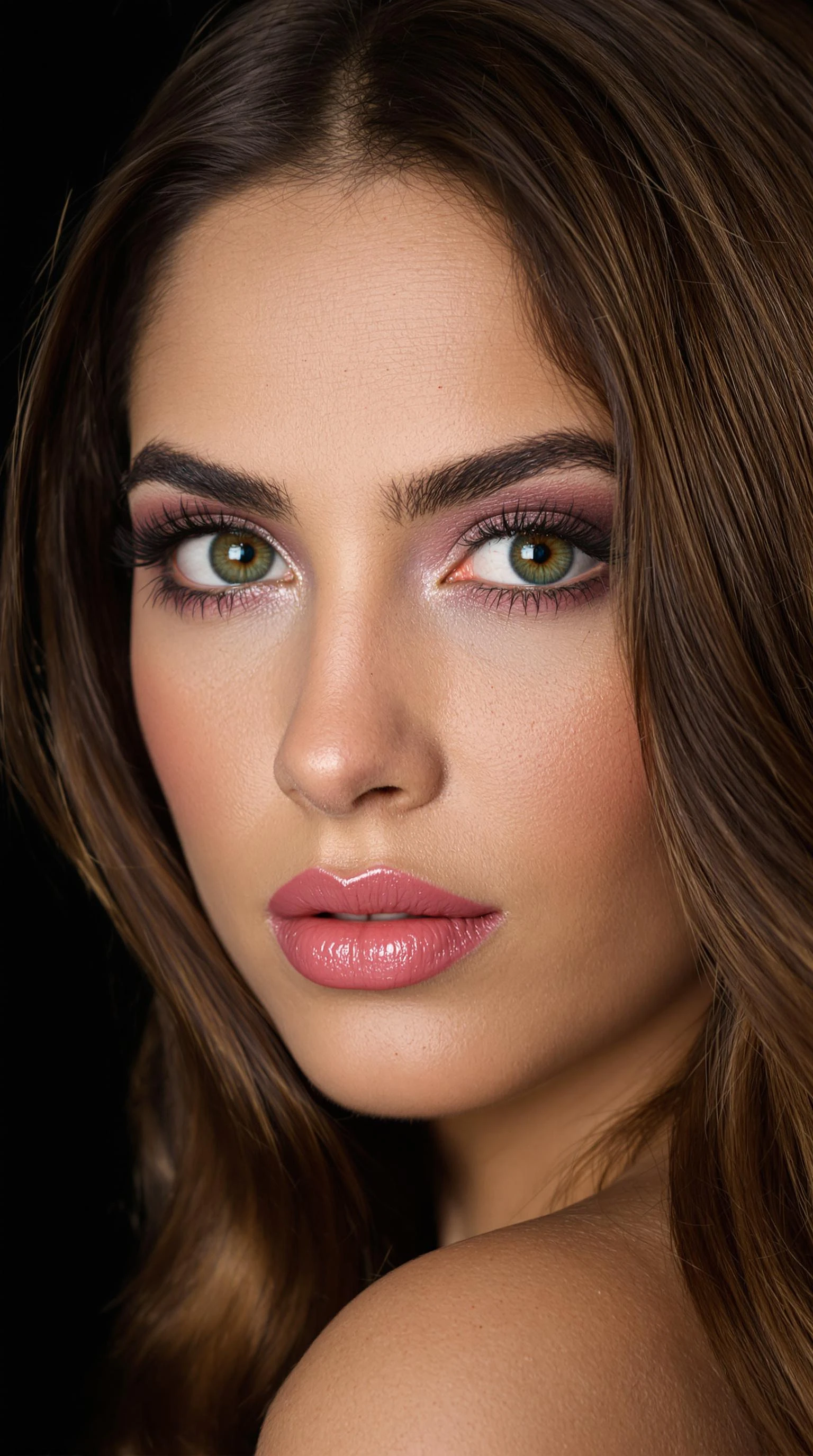 "The image is a striking close-up portrait of a woman with lustrous, chestnut brown hair cascading like a silken waterfall over her slender shoulders. Her alabaster skin radiates a gentle luminescence, enhancing her ethereal beauty. Large, soulful emerald green eyes, framed by meticulously sculpted eyebrows, and adorned with a shimmering amethyst eyeshadow, adding a touch of mystique. Her lips, full and inviting, are painted in a delicate rose hue, subtly completing her enchanting allure. The background is a rich, velvet black, which adds depth and drama to the composition, allowing her features to stand out in mesmerising focus. "