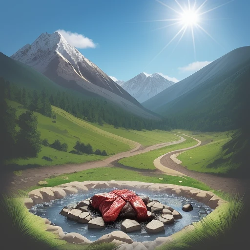 mountains, a heap of hot coals on the ground, a piece of juicy meat is roasting on a spit over hot coals, a stream is flowing nearby, green grass, sun, blue sky, super realistic photor Minimal linear lion logo, side view, vector