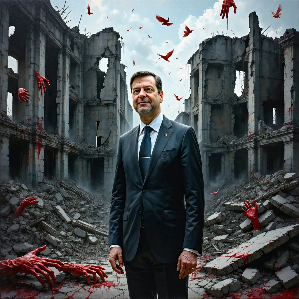 Serbian President Aleksandar Vučić in formal attire, slightly smiling, in a street atmosphere in front of the broken down façade of a train station, the background is a haunting and desolate mix of rubble from ruins of deep umber, ghostly gray, and pale white, emphasizing the isolated and mournful presence of citizens. Red hyperrealistic rubber hands are falling from the sky on him, Dim, ethereal lighting casts long, macabre shadows and soft highlights, accentuating the unsettling lines of his upright pose. The image combines advanced digital artistry techniques, including ray tracing and displacement mapping, with mixed-media digital painting. Every element is brought to life in UHD resolution, showcasing her as a sorrowful person, blending the aesthetics of everyday horror and reality in his full-body composition, in the style of Alex Ross --ar 51:64 --v 5. 2