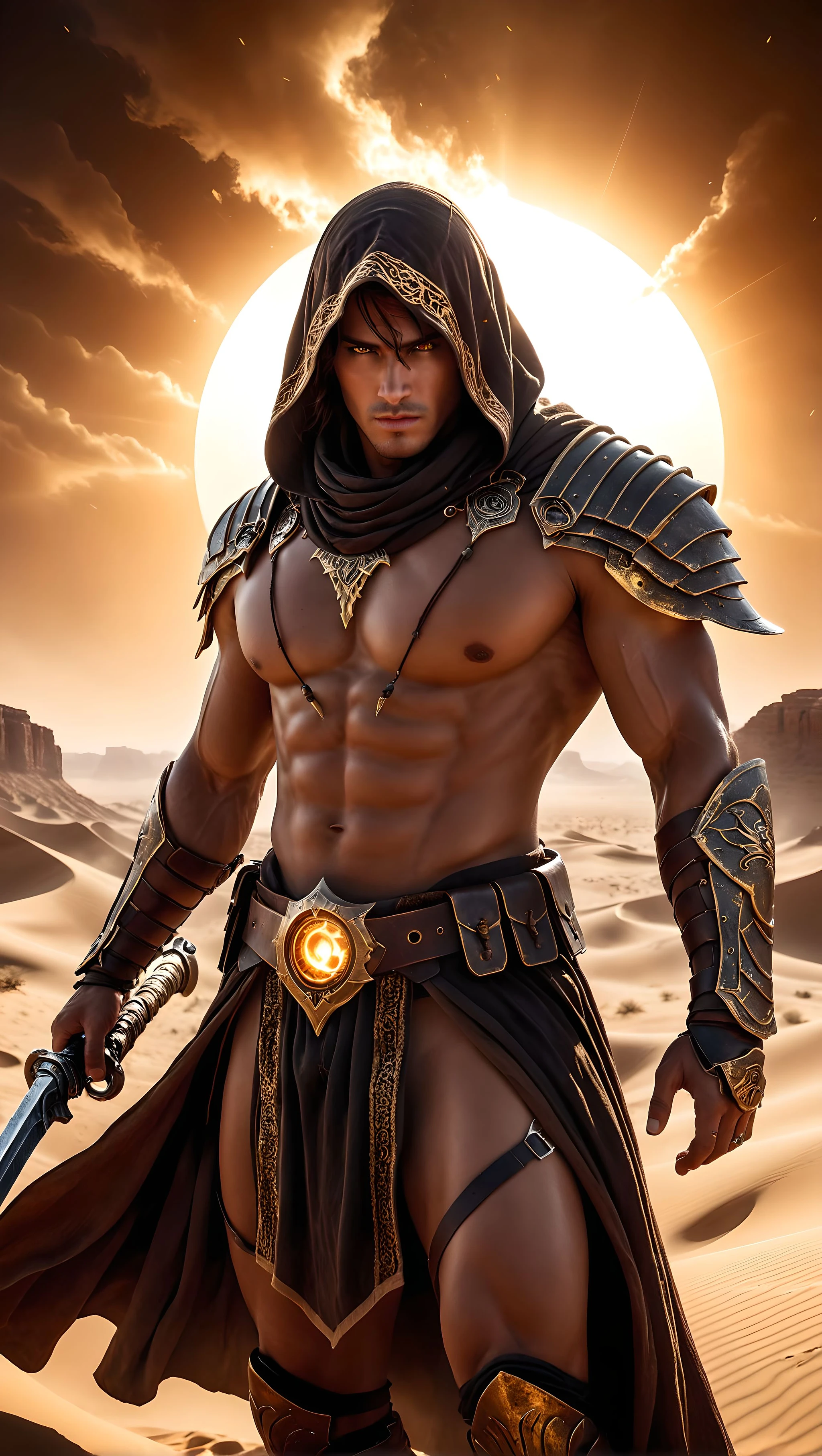 A deadly and elusive Hashashin, a phantom in the vast desert, his movements swift and silent like shifting sands. Twin curved blades gleam under the relentless sun, reflecting its scorching intensity with razor-sharp brilliance. A violent sandstorm coils around him, a tempest born from his presence, concealing his approach in a haze of golden dust. His piercing eyes, filled with hidden knowledge and ruthless precision, lock onto unseen targets. Volumetric lighting casts dramatic, high-intensity highlights, deepening the cinematic interplay between searing light and engulfing shadow. Immersive depth of field draws focus to his imposing form, accentuating the hyper-detailed textures of battle-worn garments and desert-forged weaponry. Ultra-high-definition, photorealistic rendering in stunning 8K resolution, an awe-inspiring masterpiece, trending on ArtStation