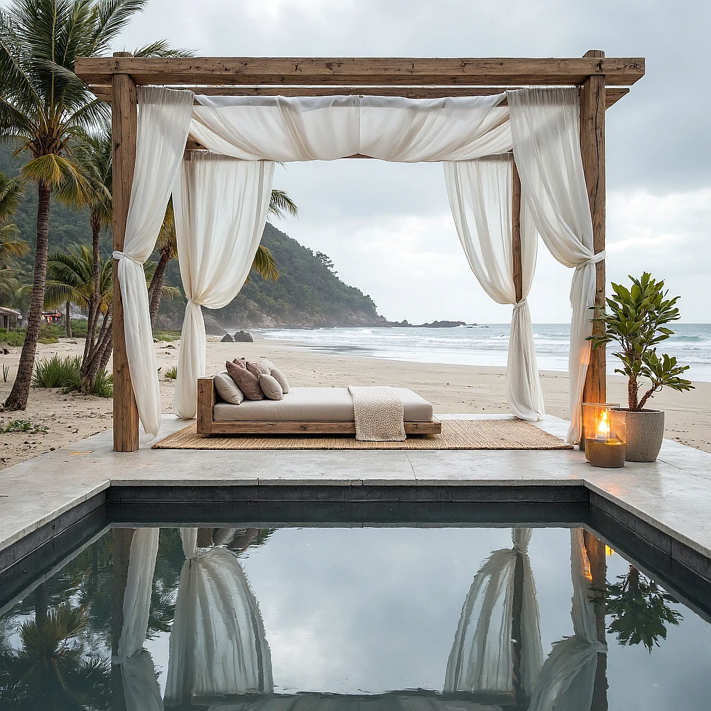 A serene coastal lounge under an overcast sky, with thick clouds blanketing the horizon and casting a muted gray tone over the landscape. The white-sand beach appears damp and compact, darkened slightly by a persistent light rain that leaves tiny droplets on every surface. The ocean is calm but textured, its colors subdued—steely blue and soft gray—reflecting the cloud-heavy sky. Centered in the scene is a luxurious open-air beach lounge, constructed from weathered teak wood, its tones rich and earthy