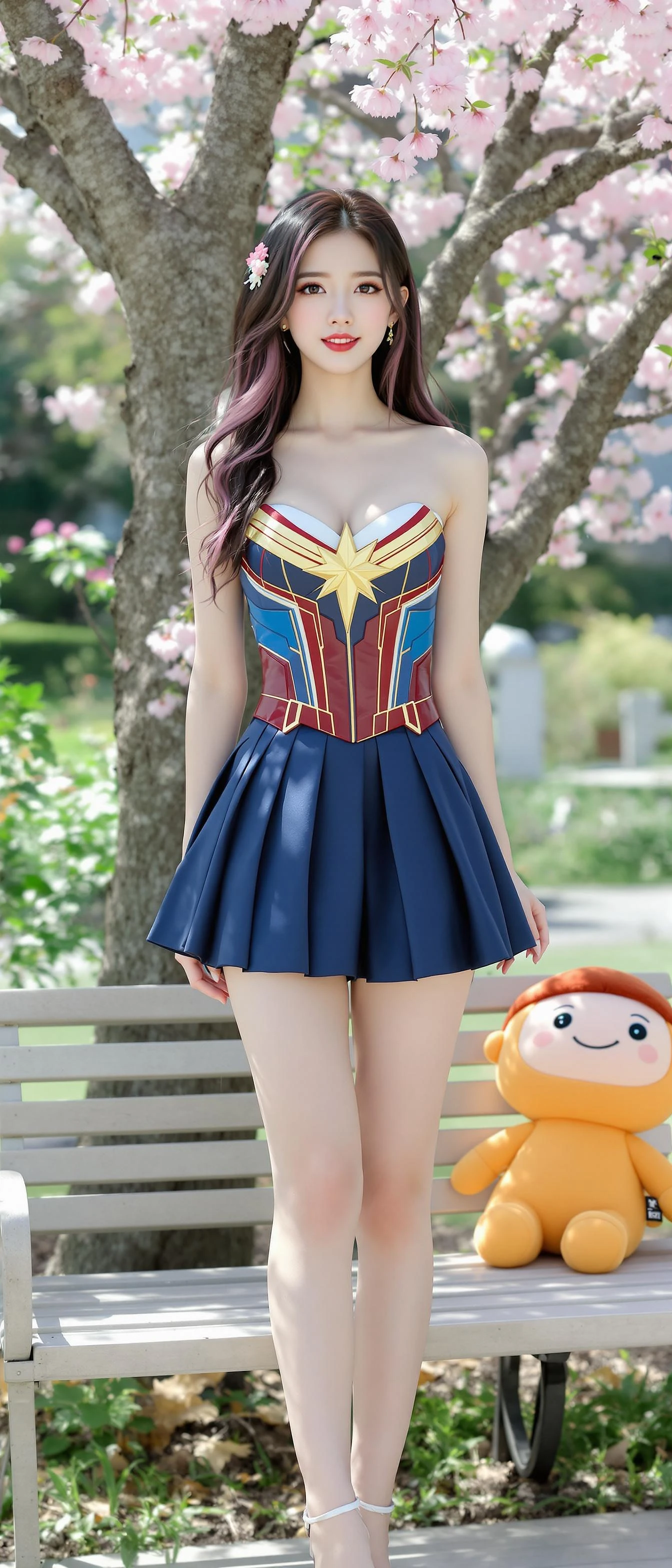 Korean girl, korean ulzzang face, full body, 1girl, outdoors, garden, cherry blossoms, standing near the tree, black hair, long hair, multi color hair, wearing a captain marvel clothes, strapless, pleated mini skirt, thick thighs, The outfit conveys a playful and wedding style. In the background, there is a bright and airy setting with some greenery and a cheerful action figure character plush toy on the bench, adding a fun and cozy atmosphere to the scene.