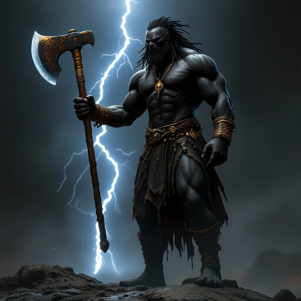 A 12 ft tall black african god of thunder weilding a double sided axe, the axe has a short handle