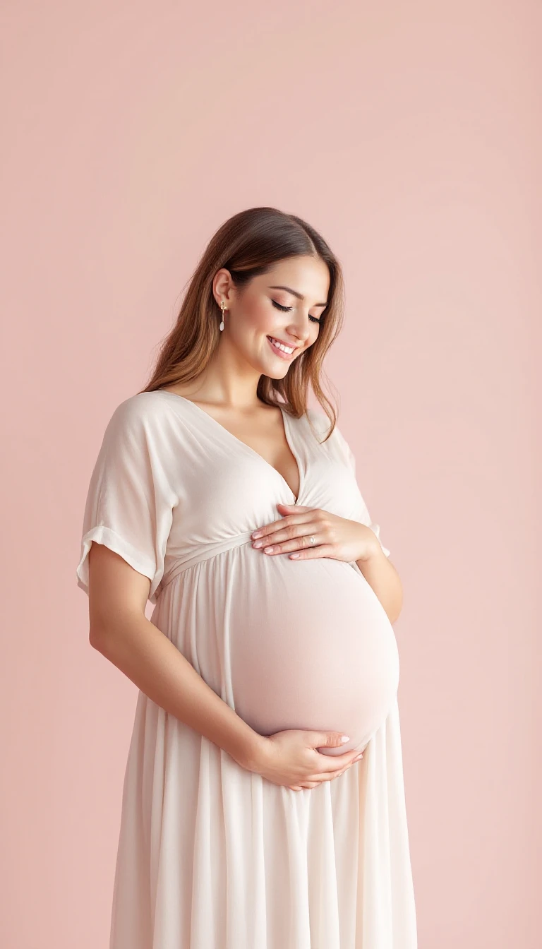 "A realistic photograph of a pregnant mother in a photo shoot, from the front, holding her belly with both hands and smiling serenely. She is wearing a long, flowing dress in a light tone (white or beige) . The background is plain in a soft pink tone, with soft, even lighting. The atmosphere conveys peace, love and expectation. Highlight details such as the sparkle in the mother's eyes and the delicate texture of the dress. "