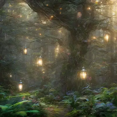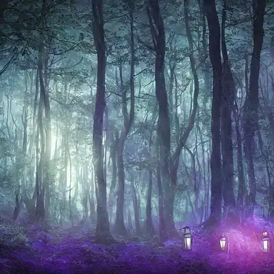 an enchanted magical forest with secrets, purple, blue and green color scheme, daylight, indirect lighting, AD magazine, Frank Lloyd, Eames, Mies van der Rohe, 3d render, super realistic, very detailed, volumetric lighting, mystical, evening, concept art, trending on artstation