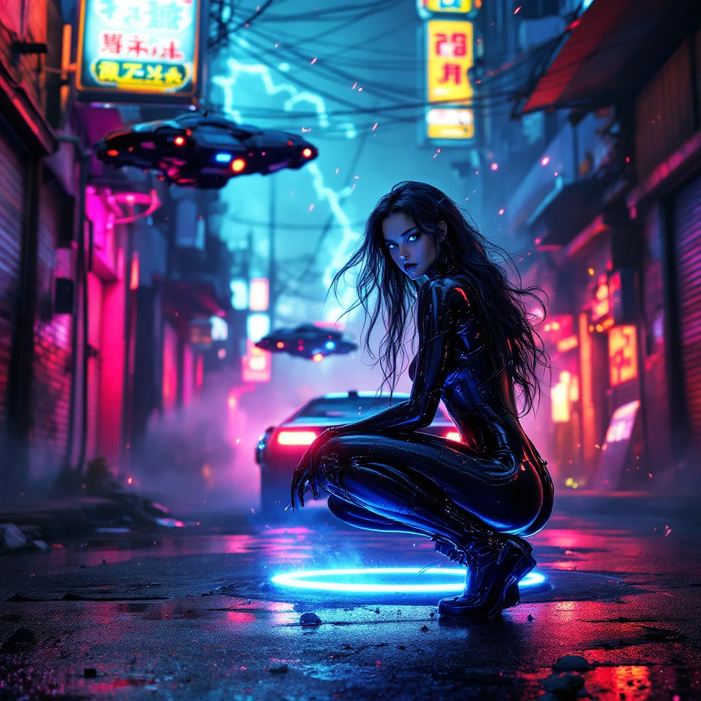 A hyperrealistic 8K cinematic masterpiece blending the gritty, neon-soaked aesthetic of a cyberpunk 1980s Tokyo alleyway with the intense action of a high-tech, futuristic battle. The scene unfolds in a dark, chaotic urban sprawl, alive with swirling fog and flickering neon lights that cast erratic, vivid glows of pink, blue, and fiery amber onto weathered brick walls and reflective puddles on the wet pavement. In the foreground, a stunning female android combatant crouches within a glowing circle of light, her sleek metallic body rendered with intricate, photorealistic detail. Her long, flowing hair moves as if caught in a gentle breeze, illuminated by particles of light and fiery sparks from a massive electrical discharge behind her. Her piercing blue glowing eyes lock onto the viewer with an aura of unrelenting power and readiness, embodying the fusion of elegance and lethal precision. Beside her, an iconic DeLorean, a symbol of retro-futuristic design, stands amidst the chaos, under siege by two hovering attack helicopters armed with M134 Miniguns. Streams of tracer ammunition pierce through the thick, swirling smoke, creating arcs of fiery destruction that illuminate the urban battlefield. The DeLorean's brushed silver metallic body gleams with reflected light from the surrounding neon signs, skyscraper silhouettes, and burning wreckage. Its taillights—one a fiery red and the other an amber hue—cut sharply through the haze, their reflections rippling across the puddles below. The surrounding environment is a tapestry of destruction and decay. Burning cars smolder in the distance, shattered glass and twisted metal scatter across the ground, while torn flyers cling to graffiti-covered walls. Overflowing dumpsters and rusted trash cans add to the dystopian atmosphere, complemented by the distant hum of sirens, the roar of helicopter engines, and the intermittent crackle of neon signs. A cracked neon sign reading "HEATWAVE" flickers erratically, illuminating the scene in pulses of vibrant energy. Volumetric lighting streams through the dense smoke, casting soft, diffused beams across the android’s gleaming body and the DeLorean’s muscular contours. Subtle reflections of nearby city lights ripple across the car’s angular lines, emphasizing its aggressive stance. The background cityscape looms, softened by the haze, with towering high-rises and distant neon signs peeking through the fog. The atmosphere is electric, alive with tension and visual intensity, as if pulled straight from an epic 1980s action-drama infused with high-tech cyberpunk fantasy. Every detail—from the fine grit on the street to the intricate mechanics of the android and the DeLorean’s polished wheels—contributes to the breathtaking realism of the scene. The dynamic composition, vibrant neon hues, and dramatic interplay of light and shadow create an unforgettable, immersive cinematic experience, perfect for showcasing on ArtStation or as a defining piece in the world of digital art.
