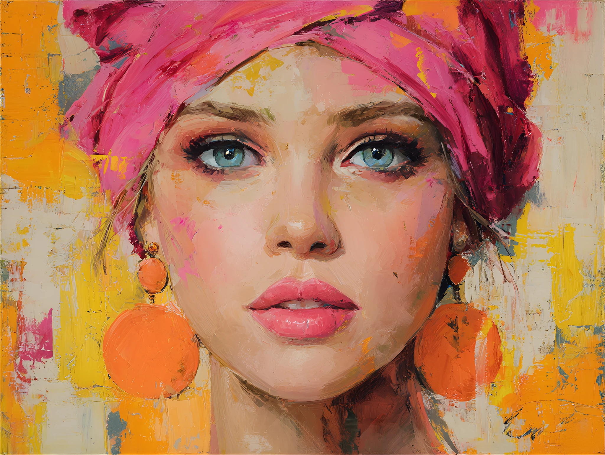 Close-up portrait of a young woman with light skin, intense blue eyes, and a striking expression, looking slightly off-center to the viewer's right. Her lips are a soft pink, and her makeup features pink and gold eyeshadow and blush. She wears a vibrant, pink-red headwrap, styled loosely and with a loose, bohemian flair. Large, round, peach-orange earrings with painted details are noticeable. The woman's face and body are depicted in a vibrant abstract style, with splashes of orange, yellow, and pink tones. The colors are bold and expressive, reminiscent of a vibrant painting. The background features an abstract mix of textured brushstrokes in warm, bright colors; oranges, yellows, and creams. The lighting is dramatic, emphasizing the subject's features, with soft highlights on the face. Modern art portrait style, ultra detailed, impressionistic, bold colors, realistic features.