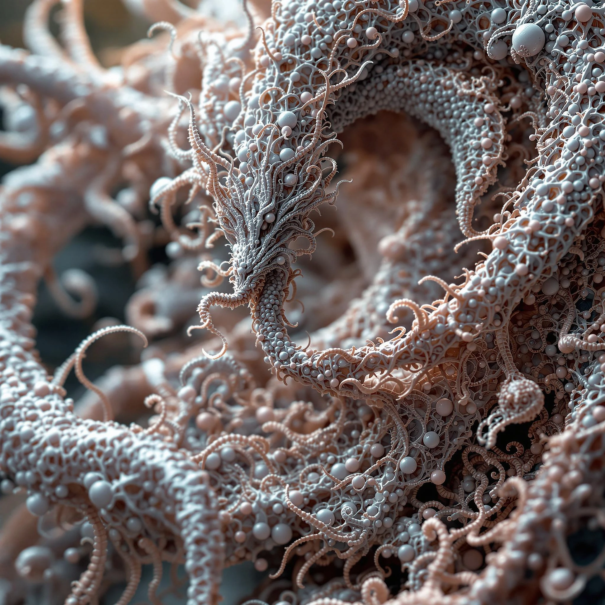close up dof render of a mythical creature made of detailed spiraling fractals and tendrils, detailed recursive skin texture