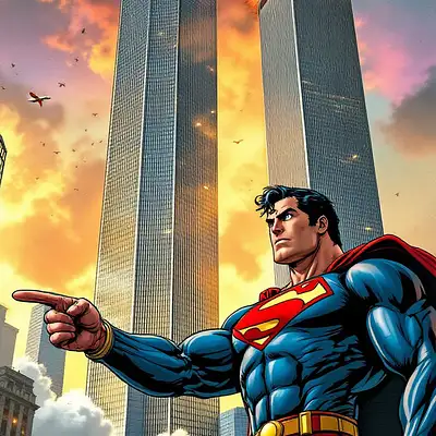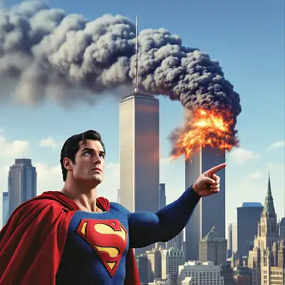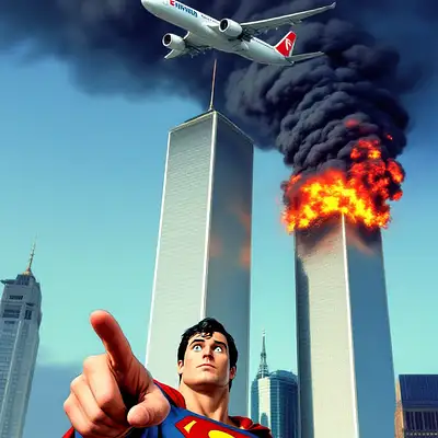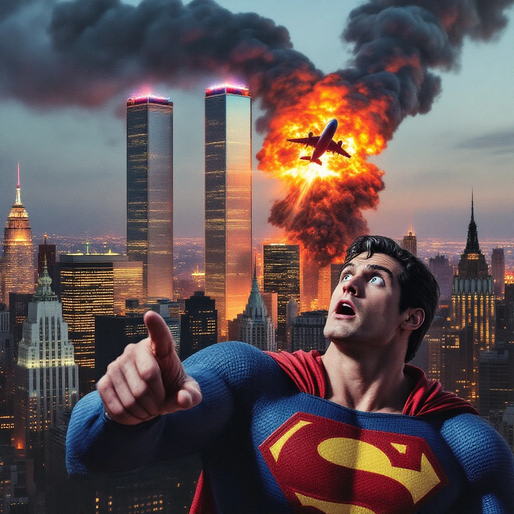 I want a photo of the twin towers and a plane about to crash into them, and in the foreground Superman pointing at the event with a surprised face and above the entire image letters that say "historia"