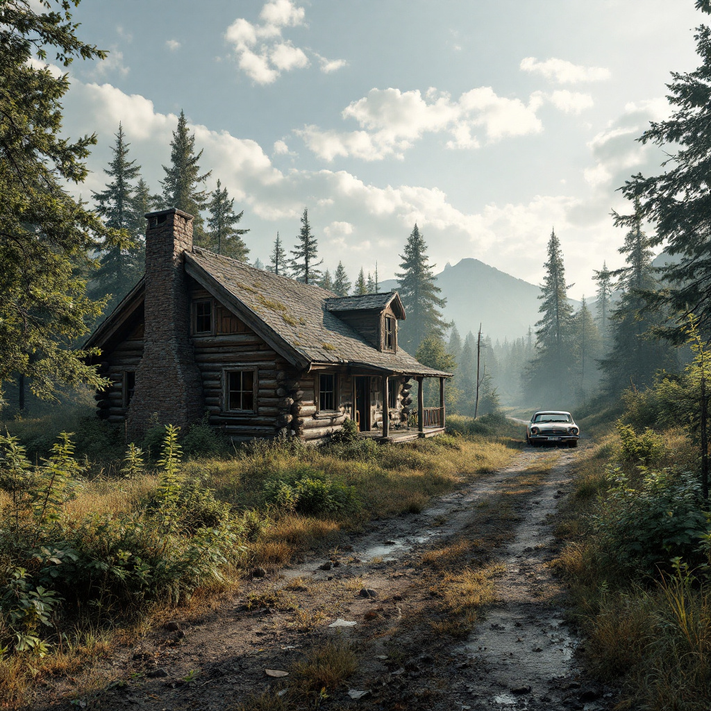 The image shows an old, dilapidated gas log cabin along side a over grown dirt road. There is a broken down 1960 looking car along side the cabin. the front yard is unkempt and over grown. (8k), (high res),ultra-detailed, photo-realistic, front view, highly detailed, volumetric, dramatic light Perfect graphics, ultra-detailed, photo-realistic, full image view, full body view, front view