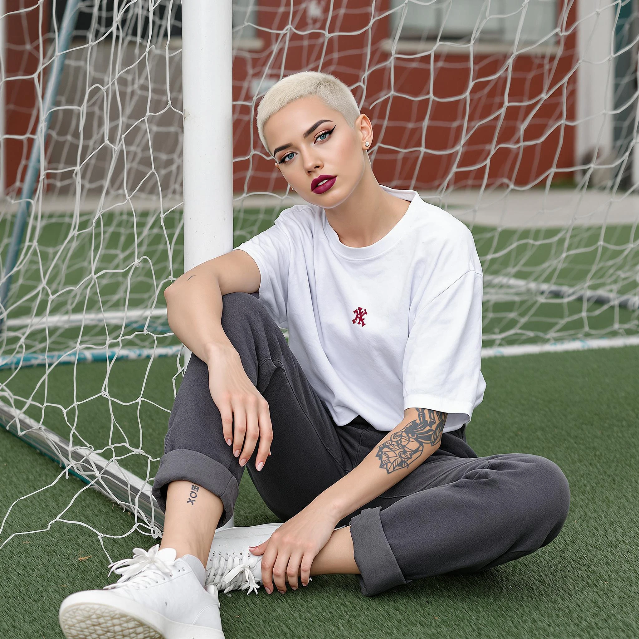 **Hyper-Realistic Urban Portrait with Everyday Realism:** A natural, hyper-realistic urban portrait of a young woman sitting casually on a green synthetic turf field, leaning slightly against a soccer goalpost. The setting is an everyday city courtyard with muted tones of green, red, and white walls in the background, creating an authentic urban environment. The scene exudes a raw, unfiltered vibe, perfectly capturing the realism of a typical moment. Her platinum blonde, closely cropped hair is styled effortlessly, reflecting soft daylight without any artificial shine. Her face, which is the central focus of the image, portrays the subtleties of natural skin tones. Her complexion is slightly matte, with visible pores and faint imperfections, creating a genuine, relatable look. There’s no exaggerated glow or flawless airbrushing—just the natural texture of skin in a regular day’s light. Her lips, painted in a matte plum shade, add a touch of boldness while staying grounded in a casual aesthetic. Her piercing blue-gray eyes look directly at the camera, framed by naturally defined eyebrows and subtle eyeliner, giving her expression depth and authenticity. She wears a loose, white t-shirt featuring a minimalist burgundy embroidered design on the chest. The fabric hangs naturally, showing small creases and folds that add to the realism. Her tattooed arms are in sharp detail, with clear ink lines that speak to her individuality without overwhelming the composition. Dark gray pants, slightly rolled at the ankles, complement her relaxed look, while her scuffed white sneakers provide an element of wear that adds to the everyday vibe. The lighting is natural and evenly diffused, typical of an overcast day or open shade. It creates soft shadows on her face and clothing, emphasizing the details without harsh contrasts. The soccer goal netting and worn turf subtly frame her in the background, adding layers to the composition while maintaining focus on the subject. Captured in ultra-sharp 4K resolution, the photo highlights all the small, natural details: the faint texture of her skin, the worn edges of her sneakers, and the slight unevenness in the turf beneath her. The overall mood is effortlessly real, portraying a raw yet confident urban aesthetic that feels grounded in an ordinary, relatable moment.