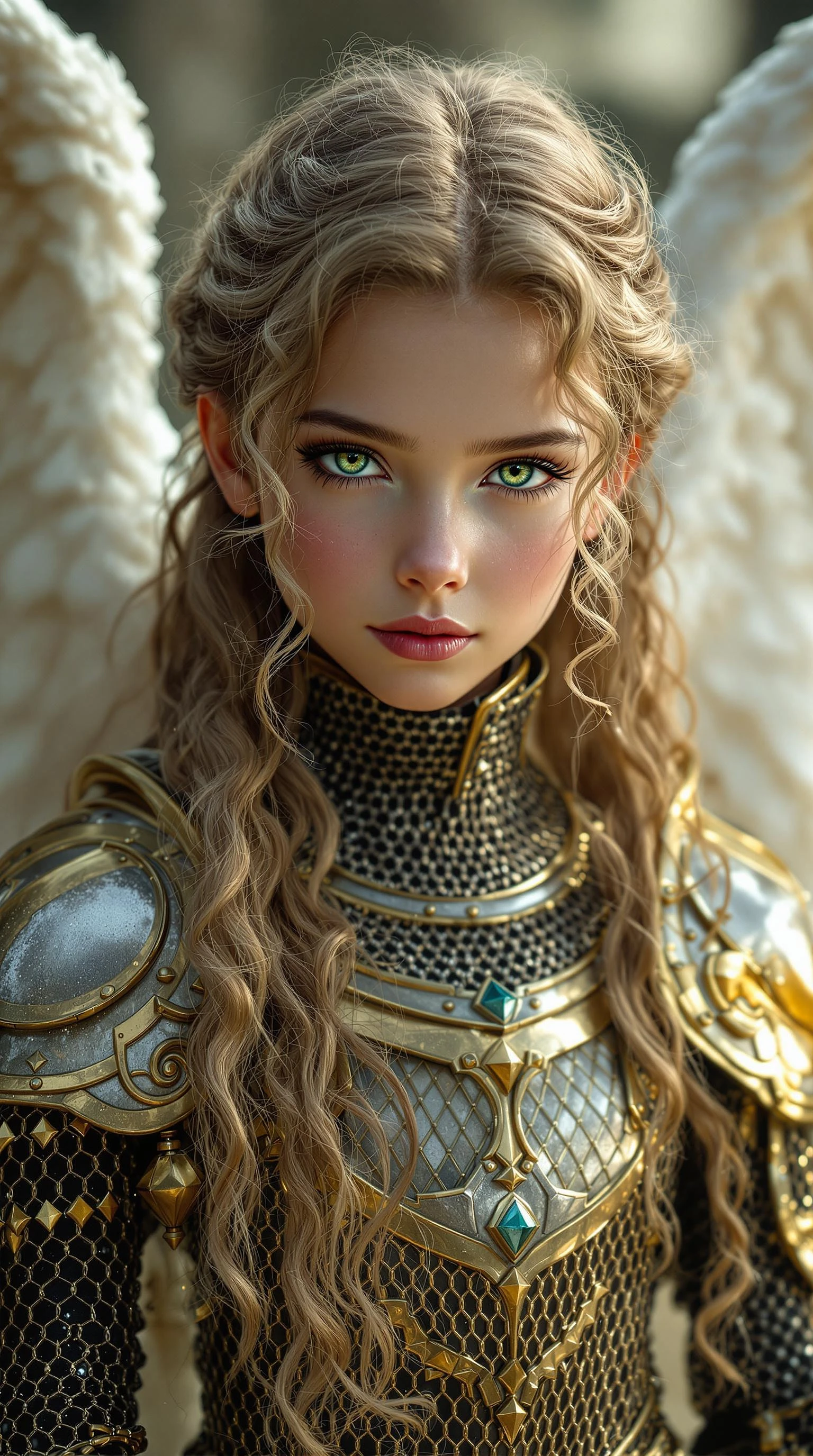 a professional photo of a exceptionally of the most beautiful angelic girl in the world, (age 11) , (futuristic) , (masterpiece) , (realistic) , (perfect anatomy) , flawless light olive skin, large beautiful brilliant Forest Tea green-blue-pink-silver-brown-golden eyes, green eye liner, light pink blush, dark green eye shadow, small dimples on chin, extremely long curly blonde, With large beautiful wings, (dressed as a heavenly angelic chainmail armor) standing on a battlefield, holding a heavenly golden staff (8k) , (high res) , ultra-detailed, photo-realistic, front view, highly detailed, volumetric, dramatic light Perfect graphics, ultra-detailed, photo-realistic, full image view, full body view, front view