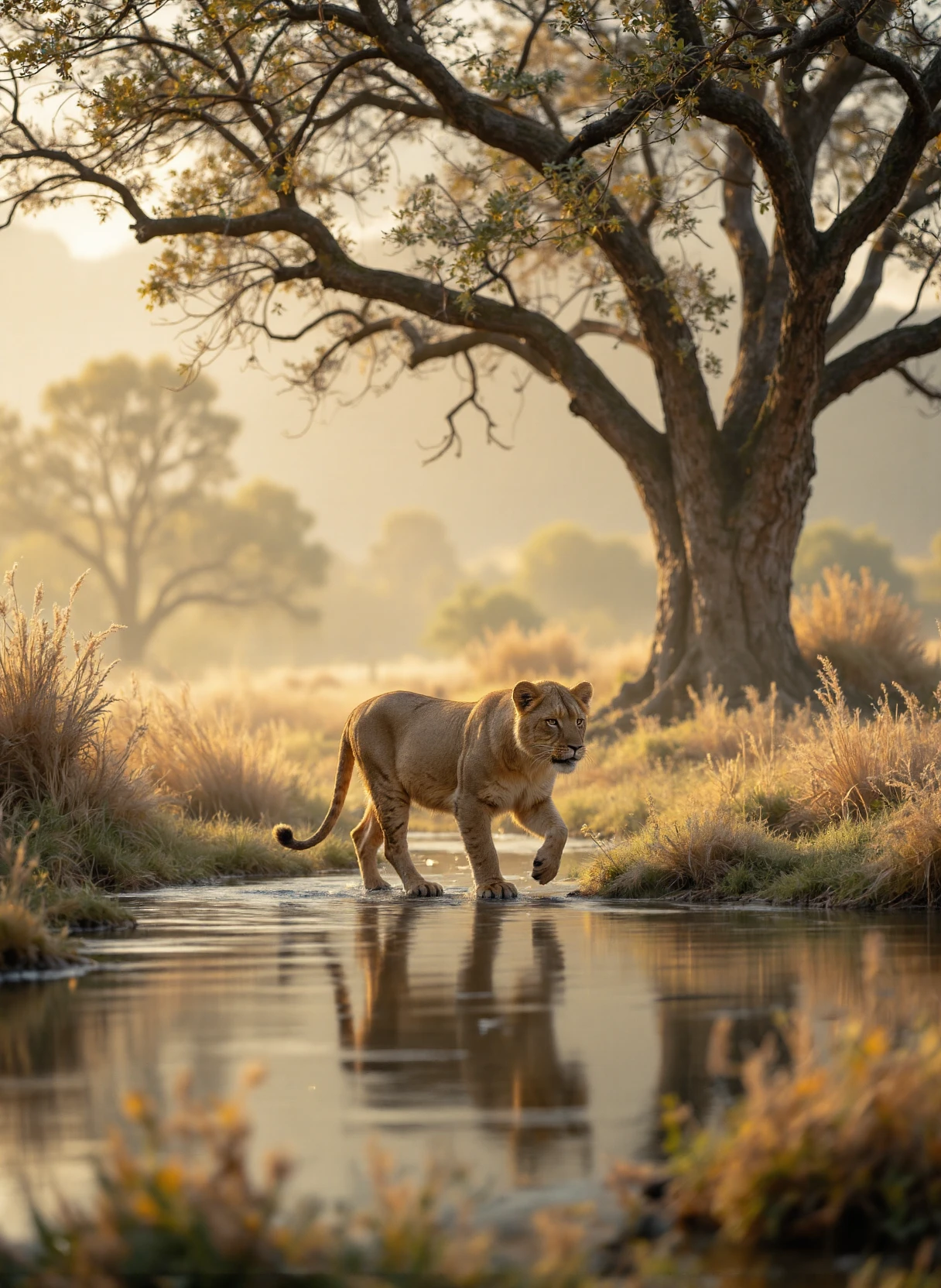 The image depicts a serene and misty landscape, likely set in a natural habitat such as a savanna or a forest. The scene is dominated by a large, majestic tree with sprawling branches and a thick trunk, positioned towards the right side of the image. The tree's branches stretch out, creating a canopy that partially obscures the sky. In the foreground, there is a body of water, possibly a small stream or pond, reflecting the soft light of the setting or rising sun. The water is calm, with gentle ripples around the edges where a young lioness is stepping in. The lioness is depicted with a golden-brown coat, typical of a lion, and is shown in a side profile as it walks into the water to take a drink. Her eyes are focused and alert, and her posture is graceful and powerful. The background features tall grasses and reeds, which are illuminated by the soft light, giving them a golden hue. The mist adds a layer of mystery and tranquility to the scene, creating a sense of calm and peacefulness. The overall color palette is dominated by earthy tones, with shades of brown, gold, and green, enhancing the natural and wild atmosphere of the image.