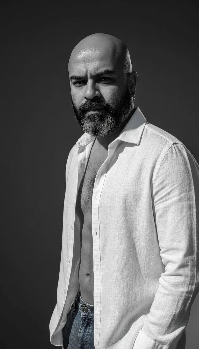 black and white photography, fashion editorial, a close up portrait of darkhaired beautiful boy is studio lights in style Herb Ritts, highres, realistic photo, professional photography, cinematic angle, dynamic light back shining,