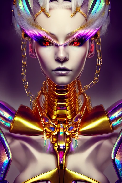 hyperdetailed stunningly beautiful female androgynous robot made of iridescent metals and shiny gems, ethereal rainbow nimbus, golden necklace, dramatic angle, noble perfect androgynous skeleton inspired by ross tran and wlop and masamune shirow and kuvshinov, cinematic, concept art, bloody intricate, highly detailed, cgsociety, octane render, 8 k, dnd digital art