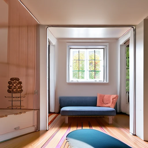 High resolution photography interior design, dreamy sunken living room conversation pit, wooden floor, small windows opening onto the garden, bauhaus furniture and decoration, high ceiling, beige blue salmon pastel palette, interior design magazine, cozy atmosphere; 8k, intricate detail, photorealistic, realistic light, wide angle, kinkfolk photography, A+D architecture