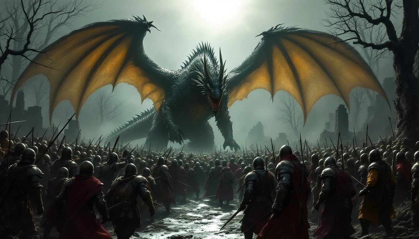 a dramatic battle scene between a large group of armored soldiers and a giant dragon. The dragon, with its wings spread wide, is the central figure, facing the soldiers with its head turned to the right. It has two horns, a long tail, and is holding a sword in its left claw. The soldiers, clad in armor and armed with swords, shields, and bows, are positioned in front of the dragon, with some wearing red tunics and others in yellow. They are scattered across the foreground, with some standing and others crouching or kneeling. The background is a dark, misty forest with bare trees and ruins, set against a gray sky with a bright spot of sunlight shining through. The atmosphere is ominous, with the dragon's presence looming large over the soldiers. The overall effect is one of intense action and drama, with the dragon's dominance over the soldiers clear.