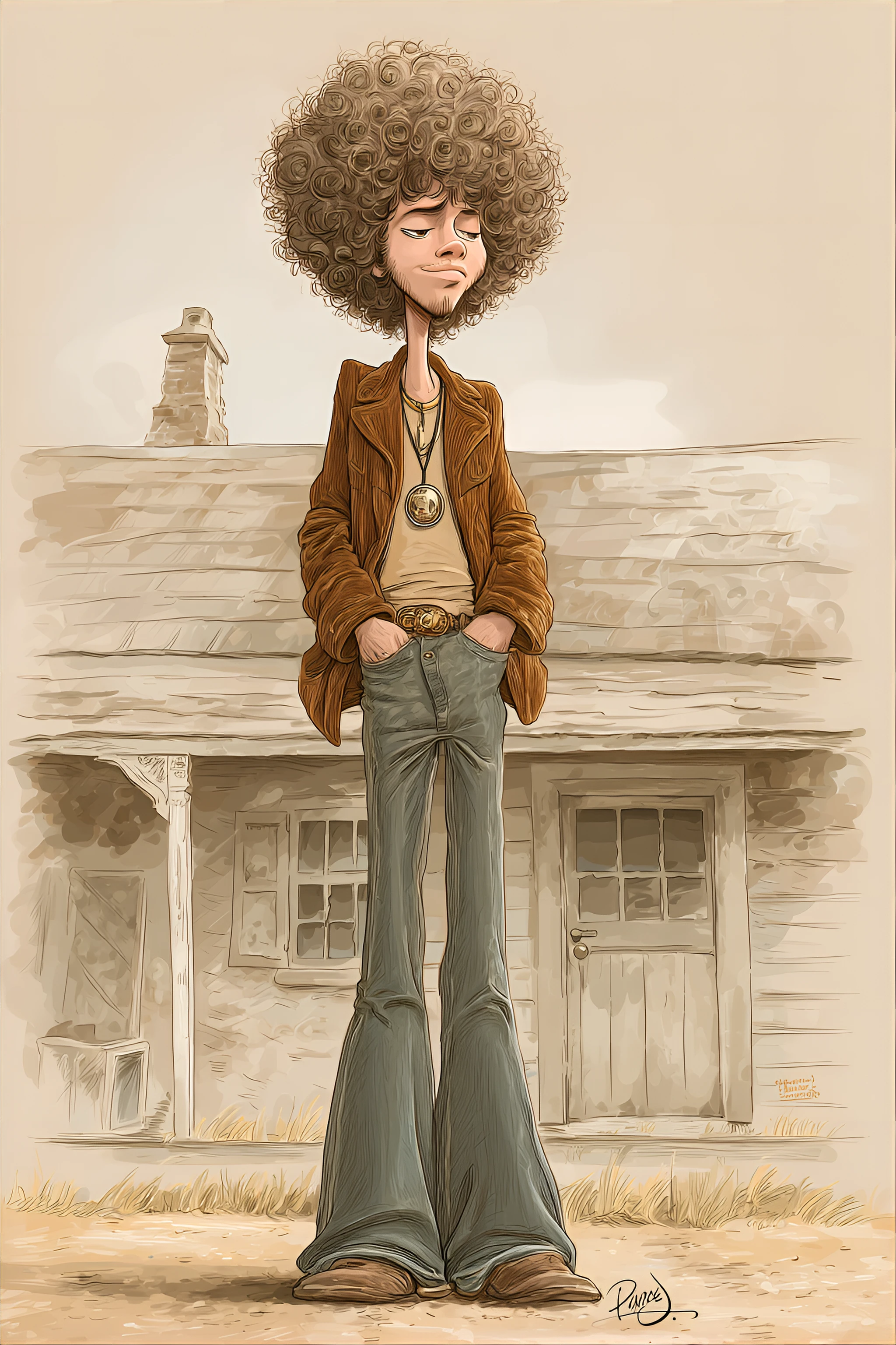 funny caricature, retro hippie caricature, caucasian ethnicity, 30 years old, free-spirited, relaxed, bohemian, exaggerated curly hair and impossibly long legs, exaggerated caricature, willowy and tall body type, round eyes, button nose, full lips, dreamy expression, the hippie is wearing a brown corduroy jacket, high-waisted flared jeans, and a neutral-toned shirt, accessorized with a large pendant necklace