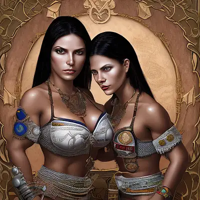 mdjrny-v4 style portrait photograph of Denise Milani and Josefa Bezerra da Silva, brazilian's gangster, athletic body, young ugly south american, traditional leather clothes of the northeastern brazilian cowboys, perfect symmetrical face, (((wild northwest) )) environment, Pernambuco and Alagoas States of Brazil landscape, ultra realistic, concept art, elegant, ((intricate) ), ((highly detailed) ), depth of field, ((professionally color graded) ), soft ambient lighting, dusk, 8k, art by artgerm and greg rutkowski and alphonse mucha