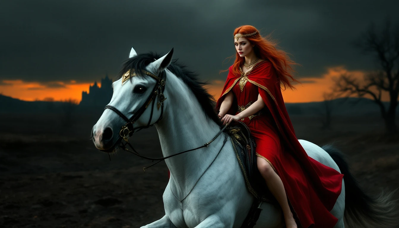 a woman in a red cape riding a white horse through a desolate landscape. The woman has long red hair and wears a red cape with gold trim, a gold circlet on her head, and a gold necklace. She is barefoot and holds a sword in her right hand. The horse is white with a black mane and tail, and is adorned with a black and gold bridle and saddle. The background is a dark, desolate landscape with a few trees and a castle in the distance. The sky is dark and cloudy, with a hint of orange on the horizon. The overall atmosphere of the image is one of mystery and adventure, with the woman and her horse riding off into the unknown.