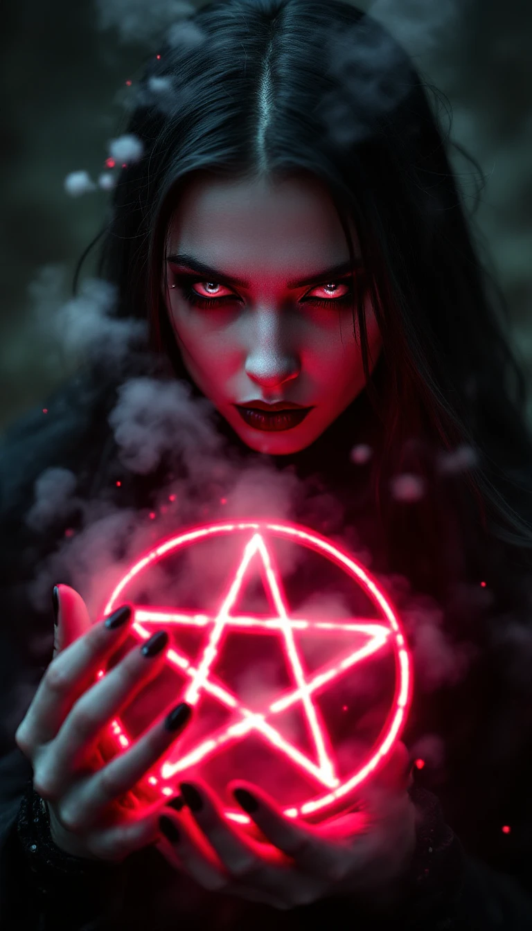 Macroview of a scandanivian model holding a red glowing pentagram with tiny fogs around, woman has gothic makeup, psychedelic scene and elements, heavy metal band scene, 16K, dark noir photography.