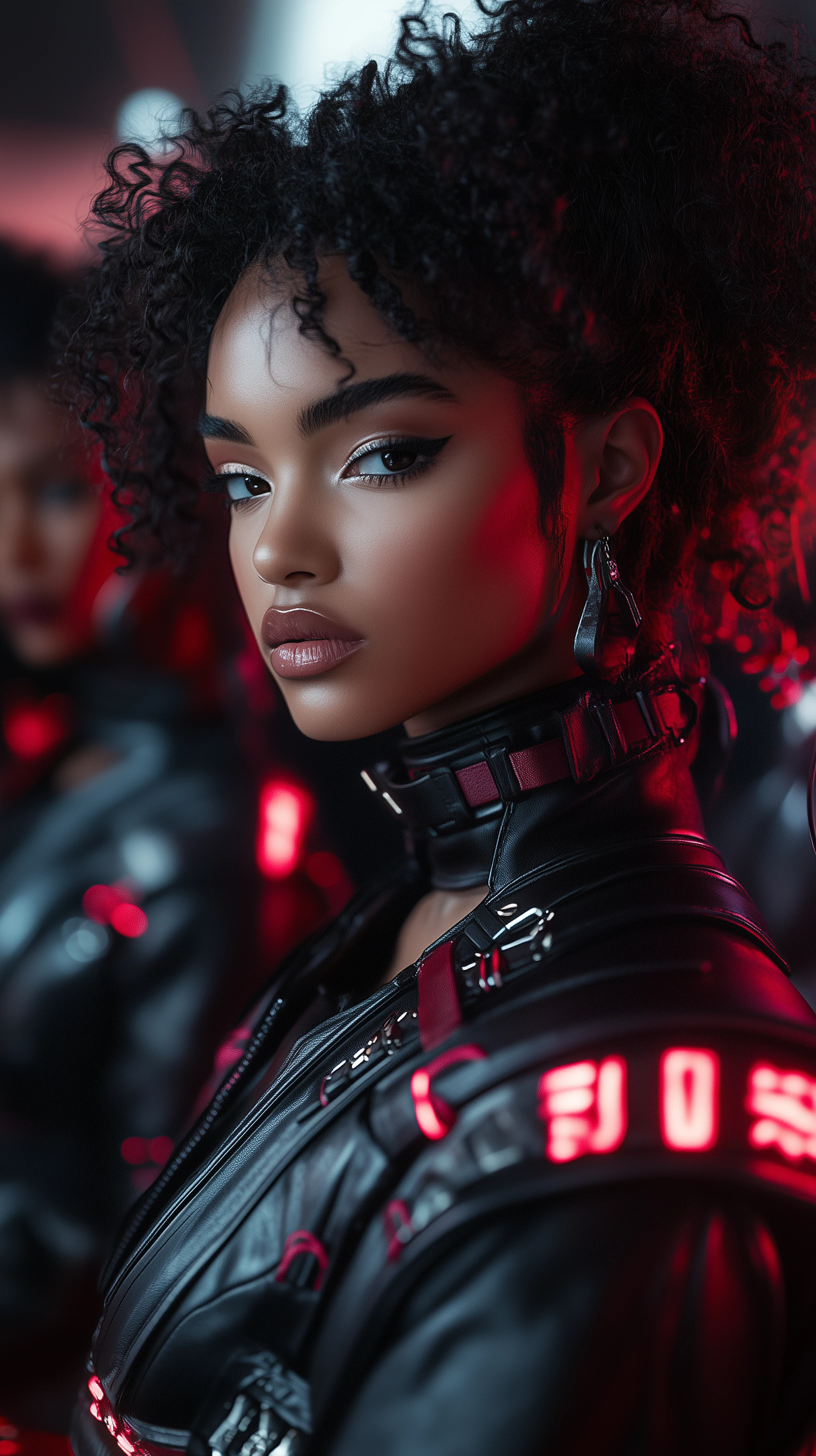 young women clad in bold, maximalist leather fashions, complete with intricate, Set against the backdrop of a dystopian planet, characterized by its desolate landscapes and fragmented cities, they embark on an epic quest in search of the elusive essence of life force. Each scene is brought to life with stunning 5D 263K rendering, enhanced by cutting-edge VFX effects that create a captivating full-view experience, immersing the audience in their extraordinary journey. --ar 9:16 --style raw --stylize 150
