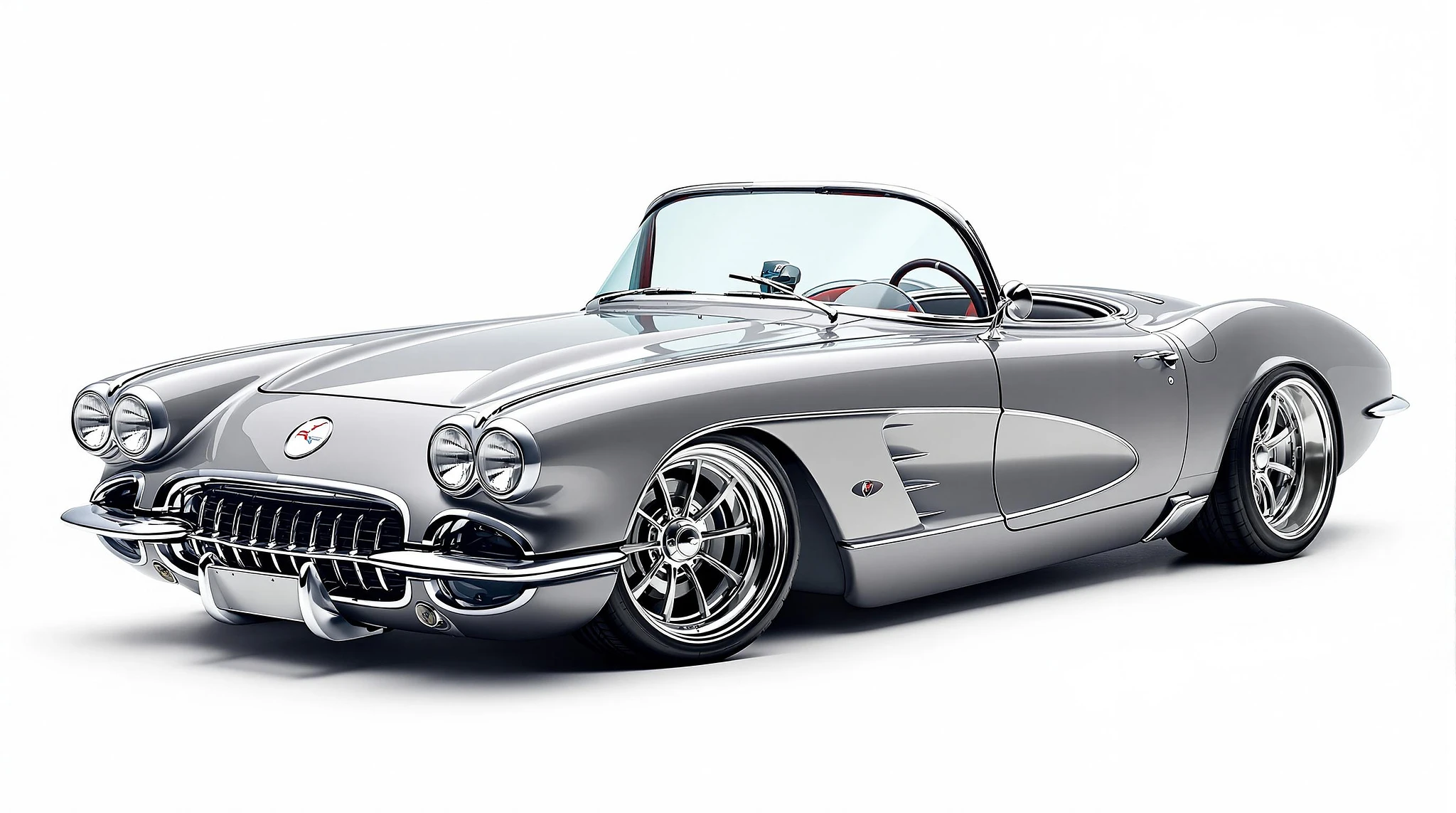 Hyper realistic 1959 chevy corvette convertible, front side top view, gray color, restomod with 20" deep dish wheels, lowered car, wide angle lens white backround.