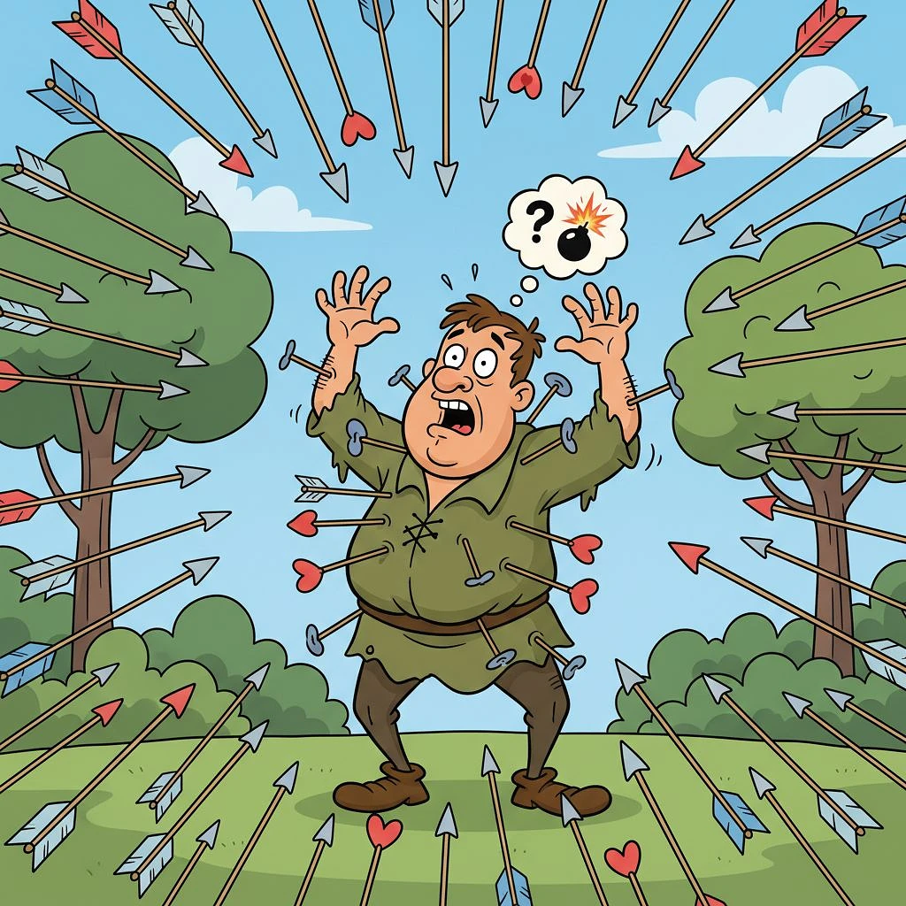 a man stands surprised, arrows sticking out of him, and arrows pointing at him from all sides. cartoon style