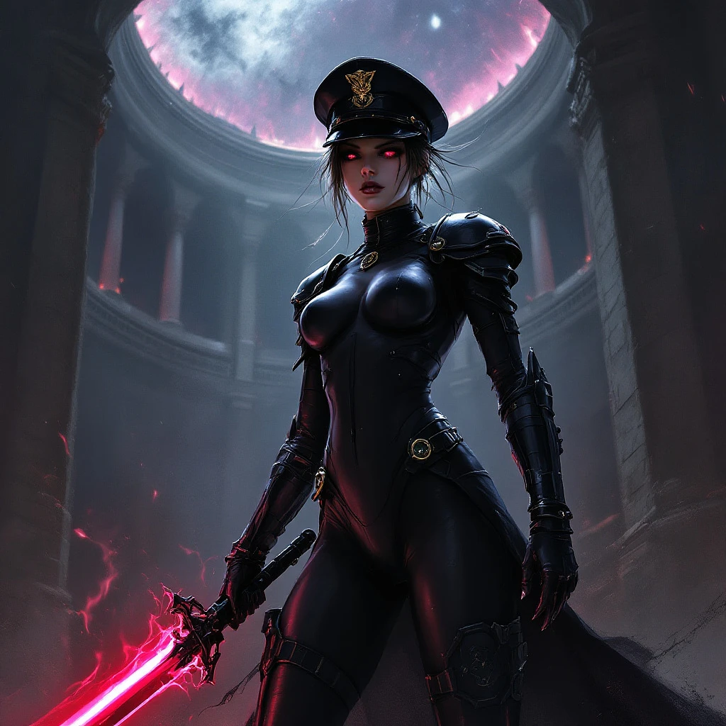 artwork in the grimdark style of warhammer 40k of a petite female comissar, standing infront a gothic circh, holding a energy sabre, scars, 1 cybereye, black ultra tight onepiece suit, officer hat, petite with small tits